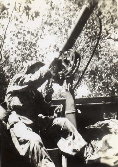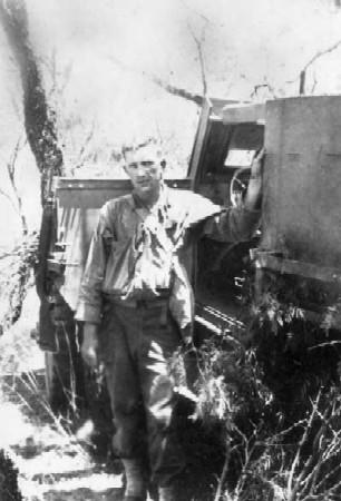 This photograph shows me manning the half track's water cooled 30 ca. machine gun during a training exercise. The machine gun was for anti-aircraft, and the half tracks were often equipped with 50 ca. machine guns that fired five rounds. The five rounds were two incendiary, two armor piercing, and a tracer bullet.