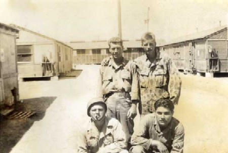 This photograph shows members of my platoon. Upper left is Marion Best, who lost both his legs at Herrlischiem. Lower left, Henry Gentry, with a cigar, part of the machine gun squad and blown of a tank by a shell and wounded, I think at the same time, with Best, Otto, Alendoerfer, Molan and Copus at the initial battle at Herrleshiem. At lower right is Phil Colunga, our half track driver. I was co-driver. On the barracks behind are the paintings that Ed Strazdes ("Graffitti Ed") painted representing each squad (they appear as small white squares), and can be seen closer on page 13. I think he used his own hair to make paint brushes.