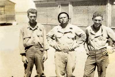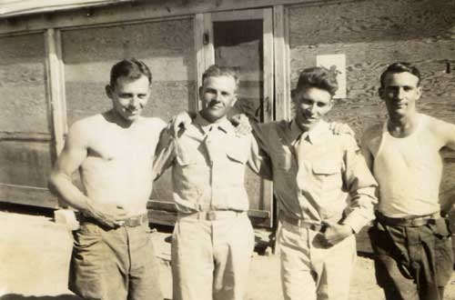 This photograph shows members of my mortar squad. "Graffitt Ed"'s painting can be seen behind on our barracks. All but John Tedrowe had been in the Civilian Conservation Corp during the Depression, and so had previous army-like experience. All of these men were wounded on January 8th, 1944 at Herrlishiem. Copus and Mullan were seriously wounded and did not return to the squad after being wounded.