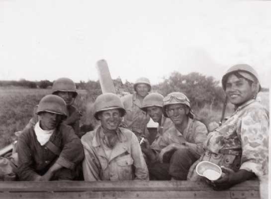 This photograph shows my mortar squad in our half track. Phil Colunga is carrying an aluminum canteen cup that burned your mouth when it had coffee in it. There was a small gas stove mounted on the fender of the half track for making coffee. Were sitting in the turret of the half track. Phil Coulunga is now wearing the camouflage, I'm not, maybe we switched uniforms. He's also wearing an ammo belt for a rifle, although as the driver he was only equipped with a "grease" gun. At Herrlisheim, Phil and I stayed back with the half Track, I was supposed to man the gun. In a mortar squad, there were only 8 members, not 12 like in a rifle squad. Everyone, except Phil and I, were killed or wounded in the first wave. I remember asking when guys were coming back wounded from the battle, "how 's the mortar squad?" and the answer was, "they all got it", this really shook me up.