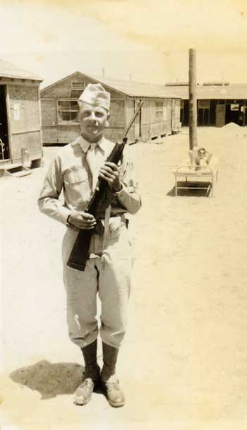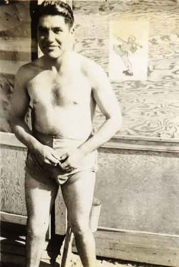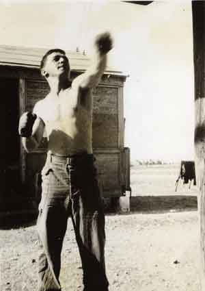 John Pamoto was a small guy, and a boxer. He's practicing with a punching bag, which I knew how to practice with as my dad had set one up in the basement of our Seattle home. John was one of the "old timers" in the company, probably 20 or older. I arrived at Camp Barkeley from the Army Specialized Training Program with 55 others, all of us 19 years old and there was a split for awhile between the "college boys" and the "old timers".