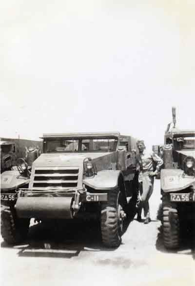 This is Phil Colunga, our half track driver, who now lives in Los Angeles. I was co-driver, and we spent a lot of time together. He was Hispanic, which was unusual in our unit. Hinajosa was the only other Hispanic I recall. I visited Phil in 1949 and he was working in a lime pit trying to support his family. He had a beautiful wife and family, but it seemed like a very hard life. He gave me a sack of oranges from a tree in his back yard.