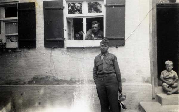Pappy Cromer, notice he has a mess kit- he was always ready to get into the chow line. Schneider ran a close second to Peoples for his talent with German woman. These is is a picture of two at their best, Pappy is waiting for the mess call to sound, and Schneider is scouting the street for women. The small boy probably lived in the house we were bunked in.